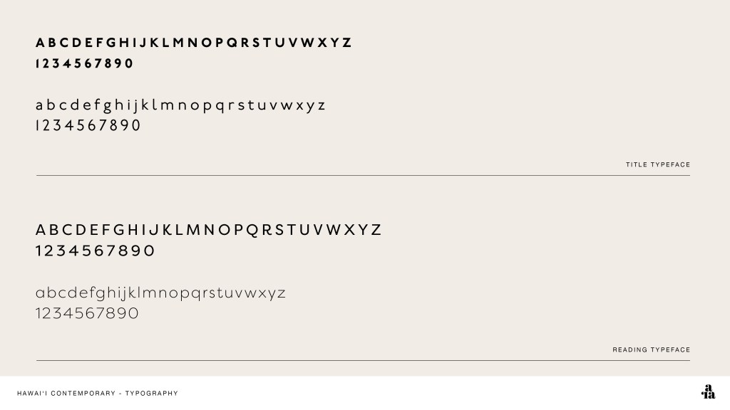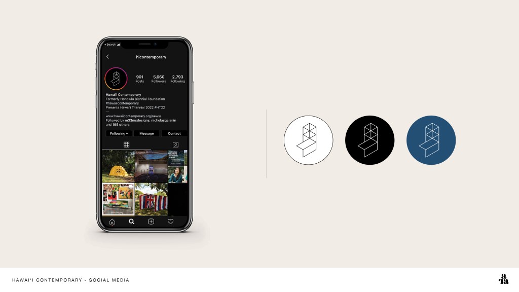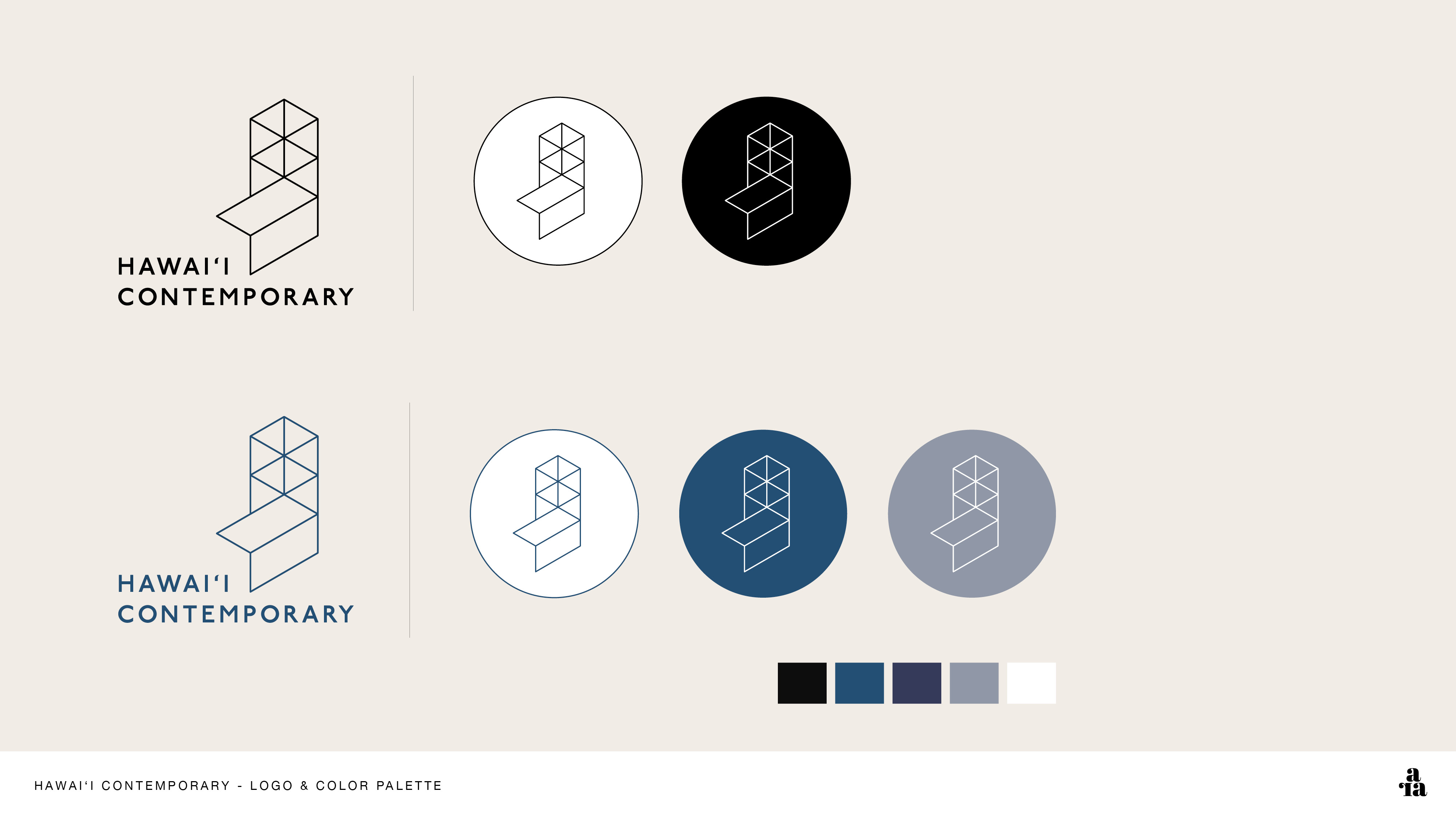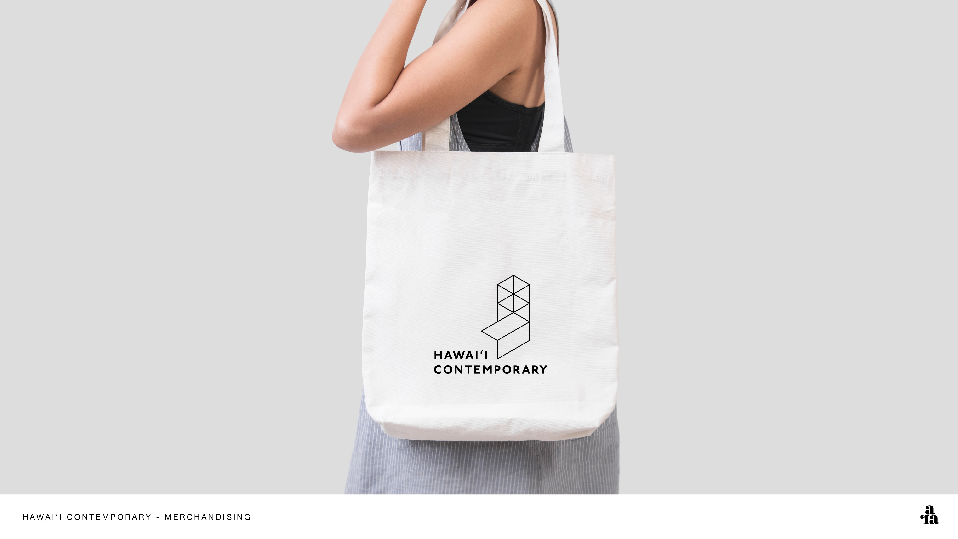 Inspired by a nihoniho (serrated) weave learned at Aupuni Space Gallery, designer Ara Laylo acknowledges the symbolism of the nihoniho as protection and grounding. The new Hawai‘i Contemporary mark is an entry point to its origins characterized with modular like architecture echoing the nihoniho weave. Selecting the best typeface to compliment the mark and the okina were important in this process.